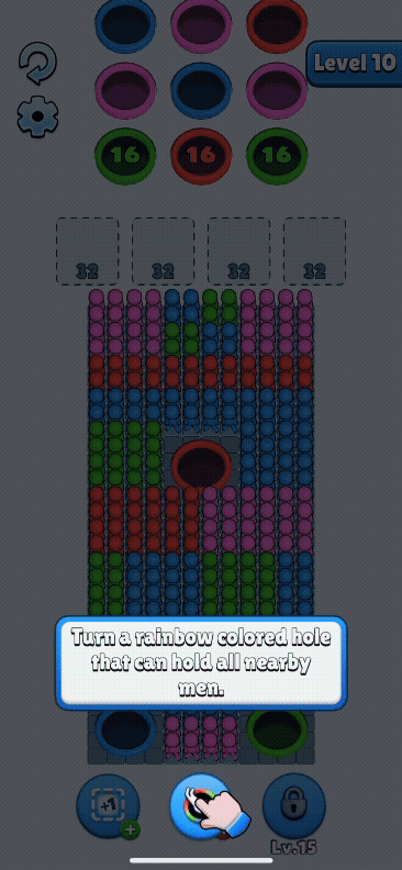 Rainbow 🌈: Turns a specific hole into a rainbow hole, instantly sending all nearby stickmen directly to their matching objective without passing through the slots.