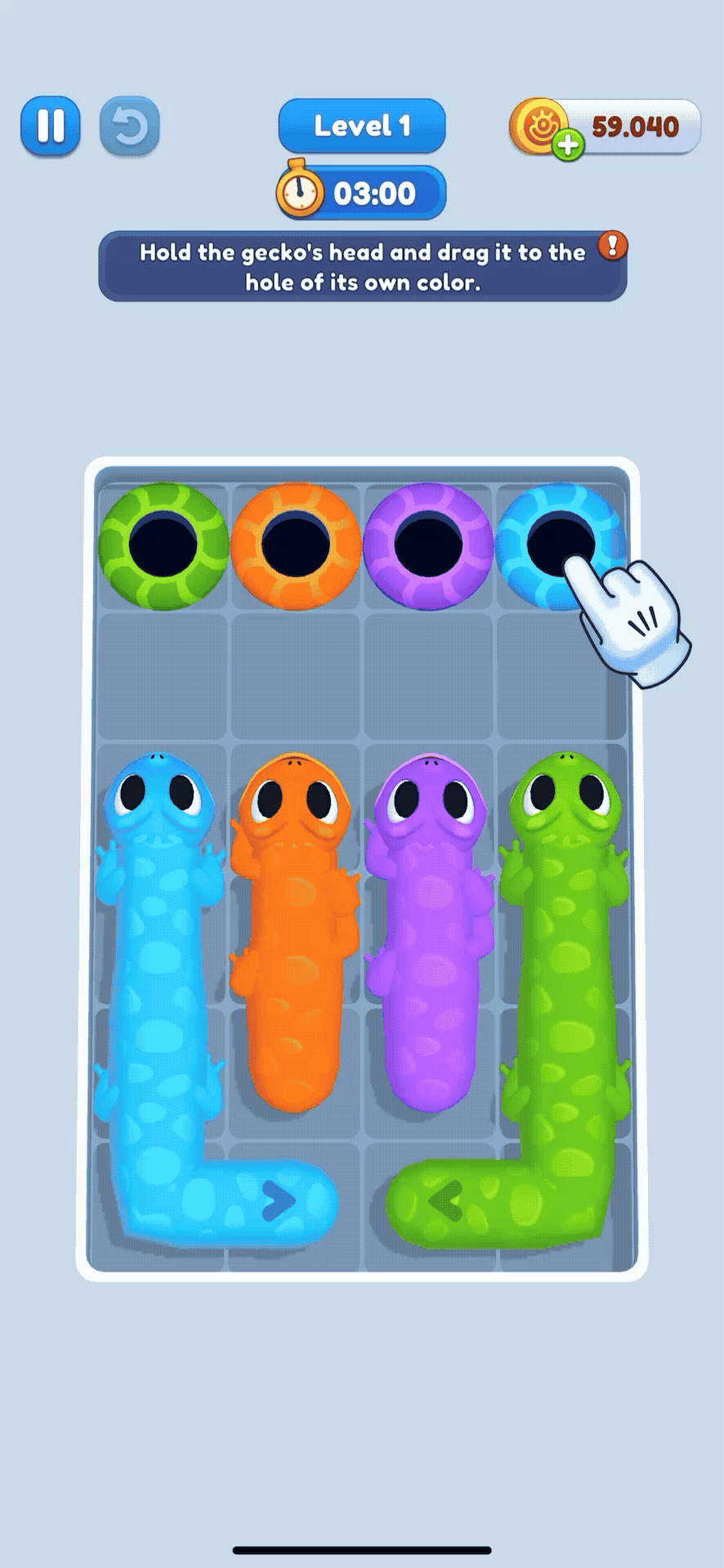 Objective: Drag the geckos from their head or tail to guide them into their matching colored holes and clear the level!🎉 Your goal is to successfully send every gecko into its correct hole before the timer runs out.